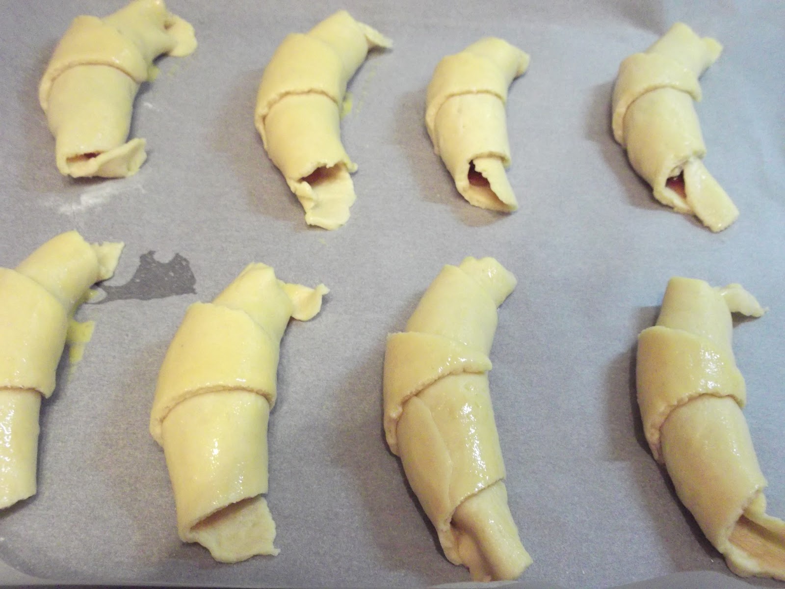 - Τα τοποθετούμε σε ένα ταψί αφού πρώτα έχουμε στρώσει λαδόκολλα,τα αλείφουμε με το αυγό και τα ψήνουμε σε προθερμασμένο φούρνο στους 180 βαθμούς για 20 λεπτά περίπου μέχρι να ροδίσουν