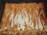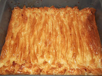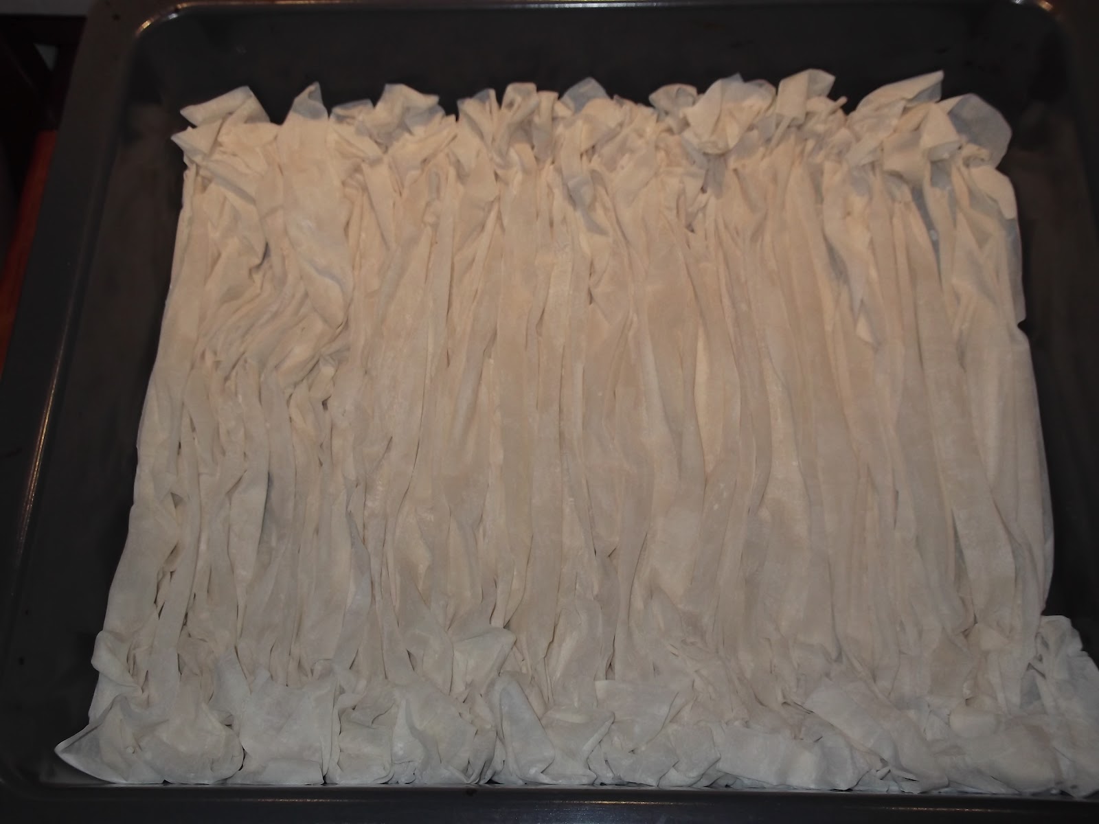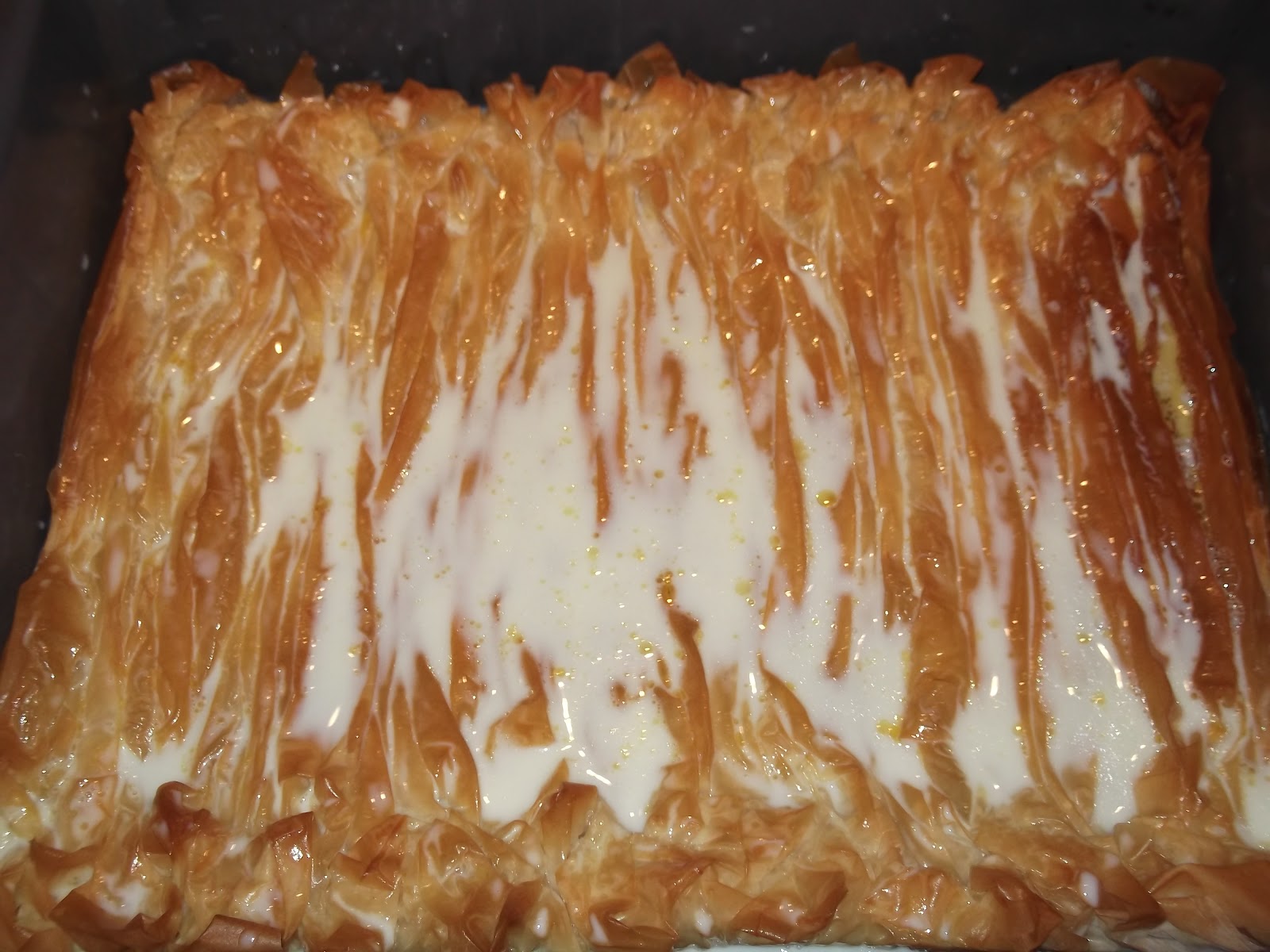 - Παίρνουμε ένα ένα τα φύλλα κρούστας και τα σουρώνουμε σαν ακορντεόν σε ενα πυρεξ